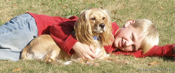 This is a picture of my son and Abbey. She is a wonderful gift from heaven! A friend found her wandering in here in Greenwood, SC. We think she is an American Cocker Spaniel or mix, roughly 3 years old. She has the sweetest disposition. She is very submissive, and I'm afraid she may have been abused. When she arrived at our home, she was a scrawny 16 lbs. She has put on a few pounds and flourished! Abbey loves to cuddle next to you when she's sleeping. She definitely