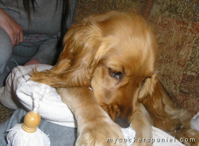 Roxie is an American cocker spaniel. She is 7 weeks old here. I fell in love with her the moment I saw her. I drove over one hundred miles home with her and during the entire drive she stayed in my lap on her back and gave me kisses. She never cried or whimpered once. Roxie is now 5 months old and her favorite thing to do is to lavish you with kisses.