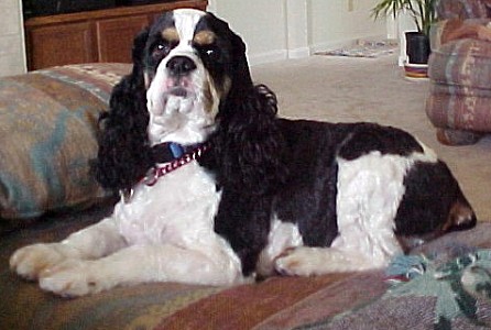 JJ's Black Bear's Bio Blackie is a very sweet and lovable boy. He loves cats and other dogs. He loves to go swimming and camping. His favorite toys are his velvet squeaky dumbell and his rubber squeaky steak. He enjoys daily exercise playing in his dog run and digging in his new sandbox for buried treasures. Blackie loves a good romp chasing the other dogs. He loves going for rides and he is at the window checking out the world. He is funny when he barks at the TV or computer when it makes car honking or dog barking sounds. He loves his rawhide bones and eats Pedigree Puppy. We plan to breed him to our little female Cocker Angel. We are in the process of building a website for our Cockers. We will keep you posted when it is done! Michael and Brenda |