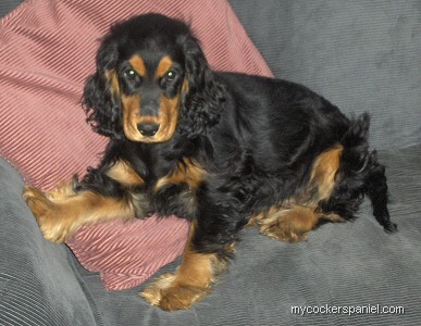 Bettina is a very happy and loved dog. She always goes with us everywhere!SheŽs a typical Cocker spaniel. In octobre weŽll take her to her first dog competition.Exciting!Her color is black and tan!WeŽve never regretted that we bought her, even tough she has eaten a lot of my shoes =0). We forgive everything!
